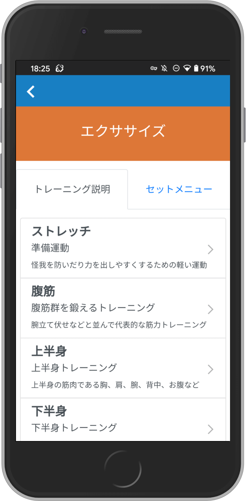 初心者でも気軽にはじめられるように各種トレーニングを写真・コメント・音声で丁寧に説明。強度別にセットメニューも設けています。